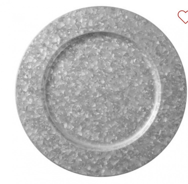 Rustic beauty with Galvanized Metal Plate Charger! This lovely charger features a galvanized metal construction and a flat rim. Dementions are 13" Round Charger Plate.