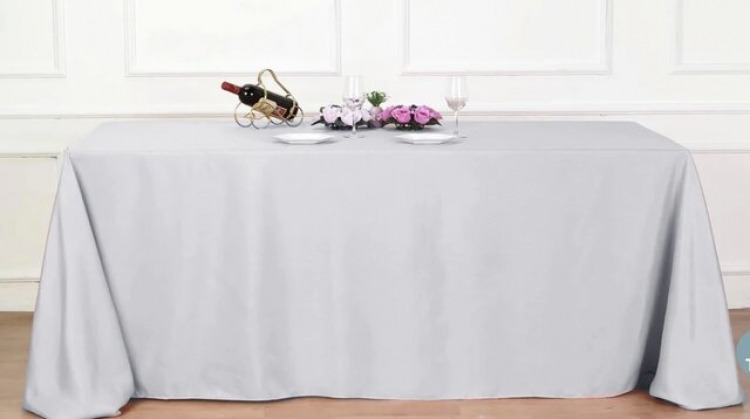 Introducing our Silver 90x156" Rectangle Table Linen, the perfect addition to elevate your table setting for any occasion. Crafted with meticulous attention to detail, this tablecloth is designed to fit our 8 ft rectangle table.