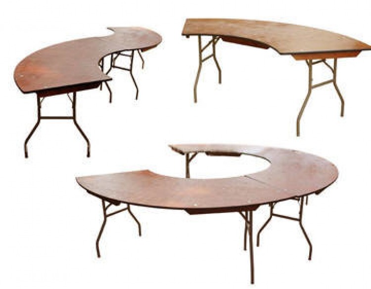 This table features a sturdy plywood top with folding steel legs. Can easily be assembled into a circle by placing approximately 4 tables together.