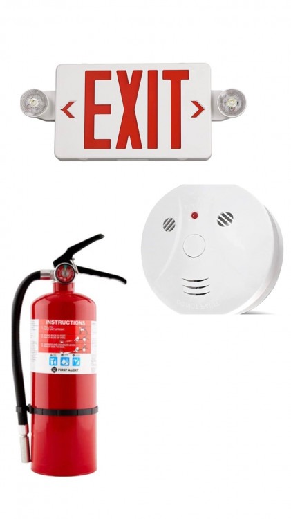 Perfect for tents with large crowds. Includes a fire extinguisher, fire alarm, and exit sign with lights.